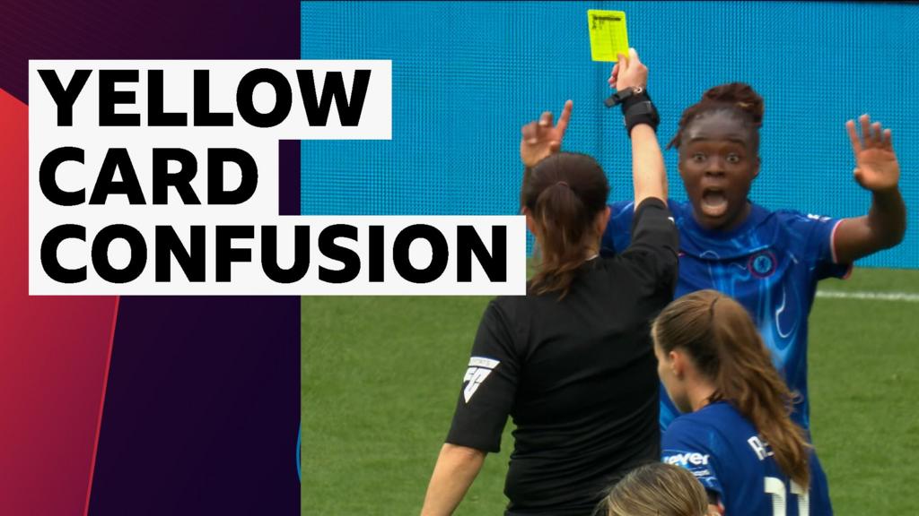 Chelsea’s Sandy Baltimore is shown a yellow card in an apparent mix-up after her team-mate Erin Cuthbert pushed over an