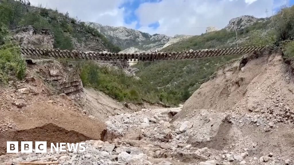 A 200m (650ft) stretch of train track was left suspended in the air following flash floods and landslides in central