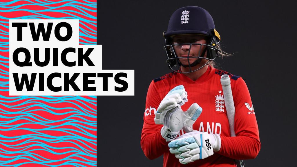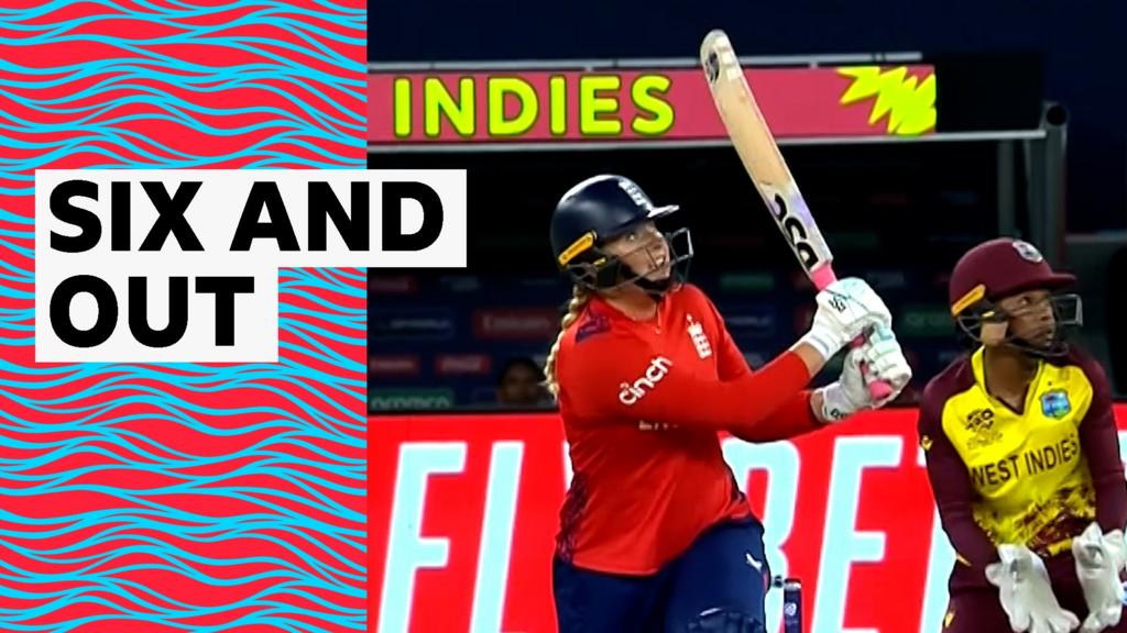 Watch as Sophie Ecclestone hits the first six of the day before being dismissed next ball, as England post 141-7