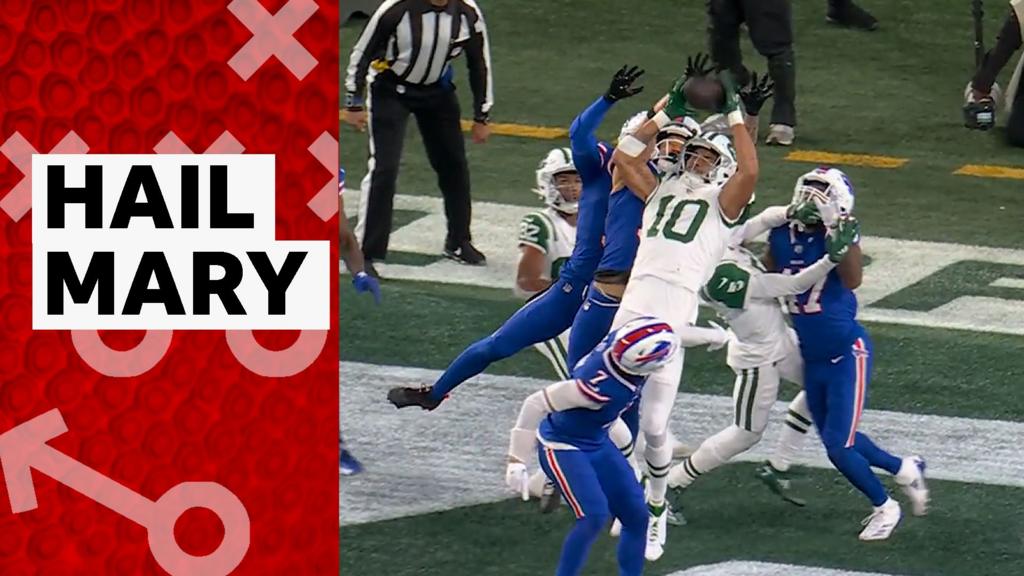 Watch New York Jets quarterback Aaron Rodgers throw a stunning Hail Mary pass in their game against Buffalo Bills.