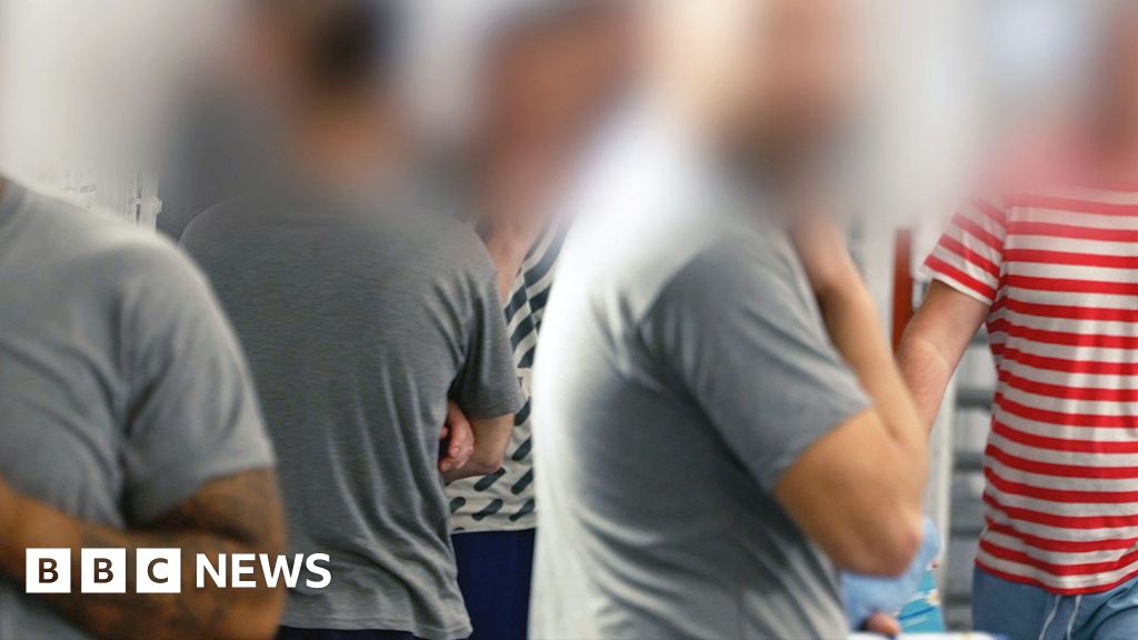 BBC Outside the security barrier at HMP Belmarsh in south-east London, a man pulls up his black T-shirt to show